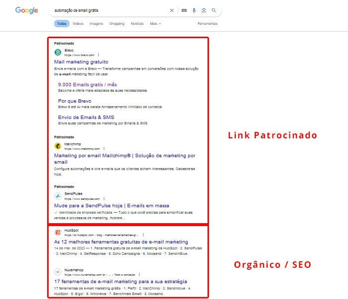 É importante saber que temos dois tipos de resultados diferentes nas entregas do Google: um deles é pago, chamado Link Patrocinado, e o outro é Orgânico ou SEO.